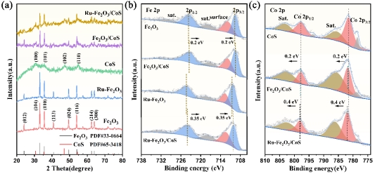 图2 (a) Fe2O3、Ru-Fe2O3、CoS、Fe2O3/CoS和Ru-Fe2O3/CoS的XRD谱图; (b) Fe2O3、Ru-Fe2O3、Fe2O3/CoS和Ru-Fe2O3/CoS中的Fe 2p XPS谱图; (c) CoS、Fe2O3/CoS和Ru-Fe2O3/CoS中的Co 2p XPS谱图。