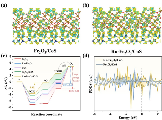 图4 (a) Fe2O3/CoS和(b) Ru-Fe2O3/CoS电荷密度差分图。黄色和蓝色分别代表电荷积累和消耗;(c) OER的吉布斯自由能图;(d) Ru-Fe2O3/CoS和Fe2O3/CoS吸附位点的PDOS图。
