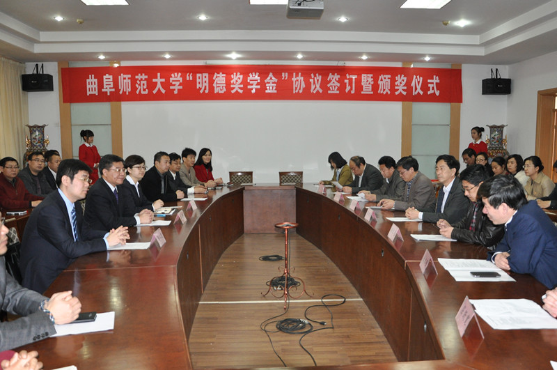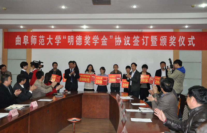 2014年3月18日上午,“明德奖学金”协议签订暨颁奖仪式在我校举行。党委书记荆兆勋、党委副书记孙文亮、纪委书记郭辰夫,山东明德物业管理集团董事长刘德明出席了仪式,学校办公室、宣传部、学生工作处、团委、日照校区管理办公室和校区学生工作办公室等单位负责人及各学院师生代表参加仪式。