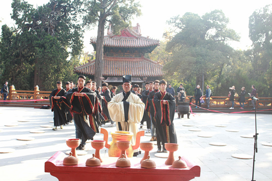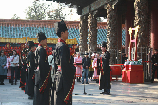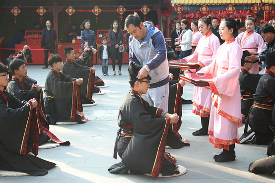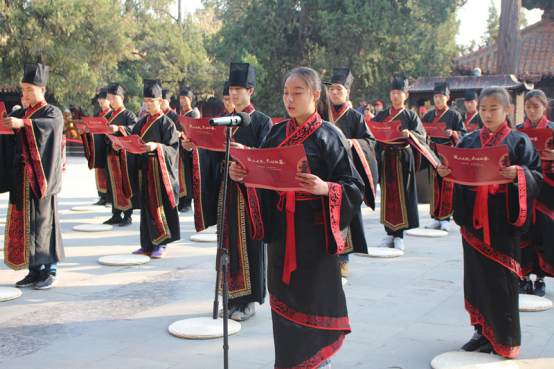 2017级新生代表在团委书记王琼及三十七届学生会主席团成员的带领下,前往孔庙,参加在大成殿前以传统冠笄礼形式举办的成人礼。