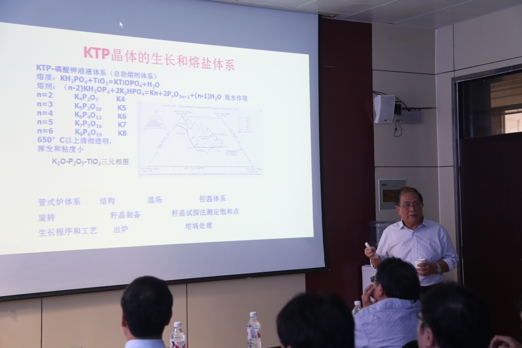 王继扬教授做了题为“光电功能晶体:生长、表征及其应用”的学术报告,报告中,王教授深入介绍了功能晶体的基本特性和晶体生长基本方法,以及功能晶体在现代高科技发展中的作用;并综述了从历年生长的多种功能晶体中挑选出的几种重要功能晶体的生长、表征及其应用,如非线性光学晶体磷酸钛氧钾(KTP)和氟硼铍酸钾(KBBF),钒酸盐系列激光晶体、激光自倍频晶体和电光晶体等,报告内容丰富精彩,富有物理深度和哲理性。在座师生对报告内容表现出极大的兴趣,争先提问,气氛活跃,互动频繁。