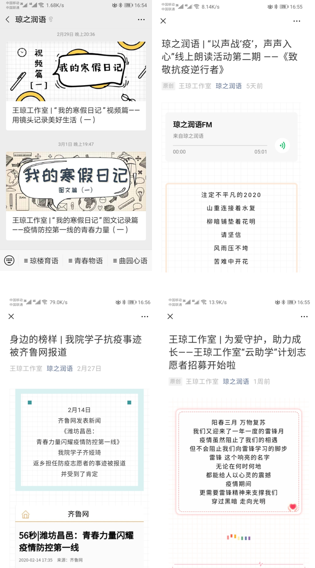 学院依托辅导员名师工作室,依次开展了“我的寒假日记”征文、“以声战‘疫’,声声入心”线上朗读、“身边的榜样”优秀学子事迹展示等一系列线上活动;同时联系平邑县第一书记的帮扶单位,开展免费为留守儿童提供课业辅导的“为爱守护,助力成长”“云助学”计划,不到一天的时间就招募志愿者近一百人,目前“一对一”对接工作已陆续展开,“云助学”活动受到了第一书记和留守儿童家长们的肯定。