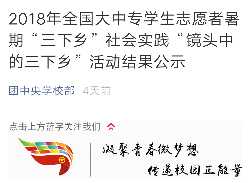 据悉,2018年全国大中专学生志愿者暑期“三下乡”社会实践“镜头中的三下乡”优秀成果遴选活动由团中央学校部、团中央网络影视中心共同举办。我校共有两支队伍经过团队报备审核、质量筛选发布、网络展示、专家评审等环节的重重筛选获得“优秀报道奖”。