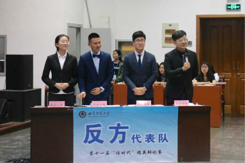作为反方,与文学院代表队就“在校大学生塑造人格与学习专业知识孰更重要”展开精彩辩论。比赛过程中,一辨破题立论,胸有成竹,清晰自信地阐述了本队的观点。攻辩环节双方围绕各自观点展开了“唇枪舌战”,赢得现场观众的阵阵掌声。自由辩论环节更是展现了辩手们超强的逻辑思维和快速反应能力。总结陈词中,辩手的论述条理清晰,层层递进,为辩论画上圆满的句号。辩论中,队员之间相互支持、配合默契,辩论双方你问我答,旗鼓相当。最后,由校团委兼职副书记马克思主义学院朱斌对本次辩论赛进行精彩点评。