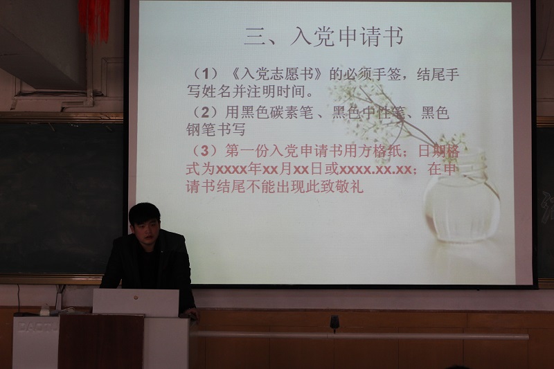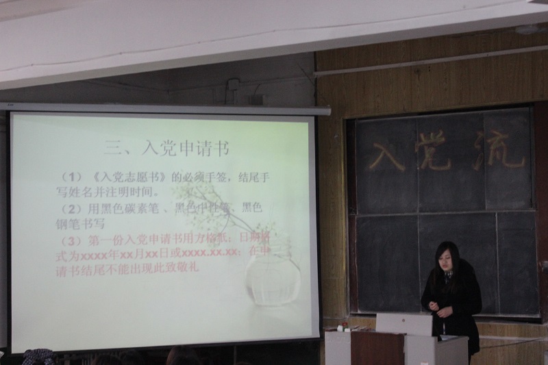 会议伊始,讲解员向2014级学生解说了入党流程的相关事项,并对入党申请条件及入党申请书格式做出了详细讲解。讲解员强调同学们能够坚决执行党的方针政策,要接受党组织的考验,以实际行动表明自己的态度,吃苦耐劳,不言放弃。大会结束后,同学们对入党有了更为全面的认识,也对成为一名中国共产党员充满期待。