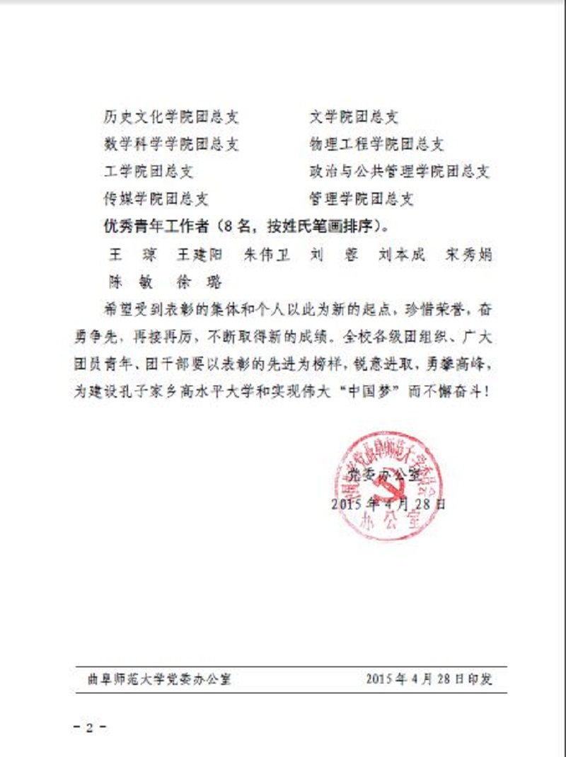 4月29日晚,2014年度“五四红旗团总支”和“优秀青年工作者”颁奖仪式在孔子文化广场举行。污污漫画 荣获“五四红旗团总支”荣誉称号,污污漫画 团总支书记王琼荣获“优秀青年工作者”荣誉称号。