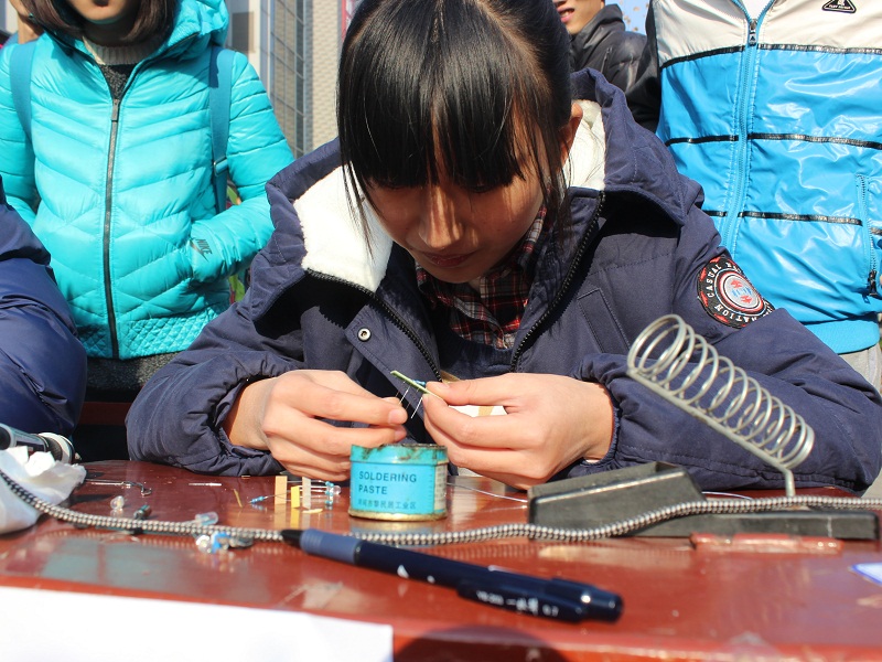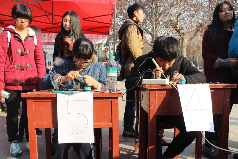 初赛内容为在规定时间内焊接呼吸灯小套件,成绩优异者将进入之后的决赛。同学们采取现场报名的方式,按其顺序分组依次进行比赛。比赛进行前,有工作人员对参赛选手进行讲解培训。选手们严格遵守规则,争分夺秒完成焊接内容。最后,工作人员根据灯泡是否闪亮、焊接点、美观度等方面对参赛作品进行打分。比赛吸引了各院系同学前来参观学习。