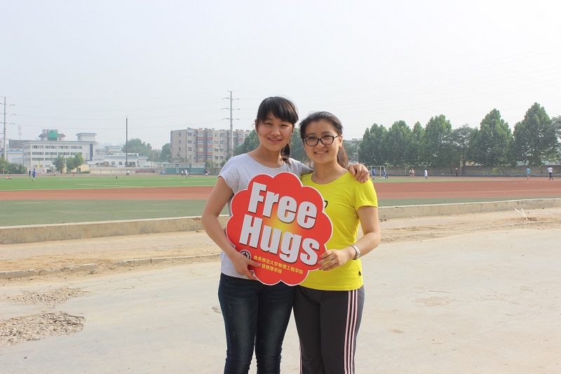 活动一开始,三十余名大学生随机分组,大家拿着“FREE HUGS”和“微笑,传递正能量”的宣传标语拍,大家两两拥抱,同学之间那种单纯的友谊,在一个个的微笑拥抱中传递着。本次活动我们还要请了外籍教师Professor Kevin参与到我们的活动中来,在他的建议下,我们全体同学相拥在一起,来了一个大大的HUG。