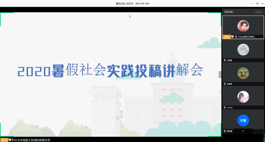 利用腾讯会议线上举办2020暑期社会实践投稿讲解会。此次会议由学院学生会社会实践部王茹瑗主讲,社会实践部部长杨玥和各社会实践团队负责人参加会议。