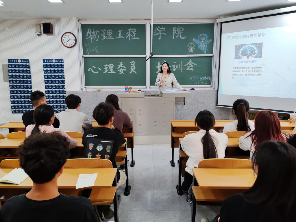 会议伊始,朱佳文首先强调了心理委员在学校心理健康教育体系中的关键角色及其所肩负的职责,既是教师与学生之间的重要桥梁,也是同学们心理支持和情感倾诉的主要对象。在后续的培训中,针对大学新生入学适应、心理委员的工作职责、大学生常见心理问题及其应对策略进行了深入讲解。鼓励班级心理委员对同学们保持关注,尤其要做好信息收集汇报、初步评估和支持,同时在做好班级心理健康教育工作的同时,也要关注自身的心理健康状态。