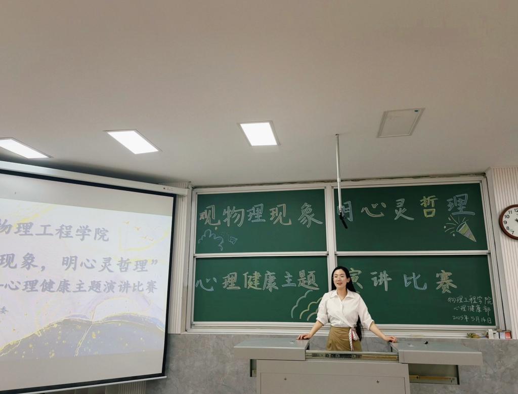 赛前,朱佳文在动员讲话中鼓励参赛选手积极分享心理成长故事与调适方法,通过物理现象阐释心理发展规律,以跨学科的思维碰撞实现共同成长。比赛中,参赛选手选取生活化物理现象为切入点,充分发挥专业特色,将成长经历与物理知识充分融合,深入浅出地阐释心理健康知识。选手们以"光的折射"为喻,生动阐释"转换视角,困境亦可折射出别样光彩"的积极心态;借"摩擦力"的物理特性,辩证解读"成长路上的阻力恰是前进的动力"的人生智慧。选手们创造性地用物理知识解读心理现象,让科学原理变得富有启发性和感染力,现场反响热烈。赛后,评委针对语言表达、内容深度、情感传递等多个维度进行综合点评,最终评选出一、二、三等奖。