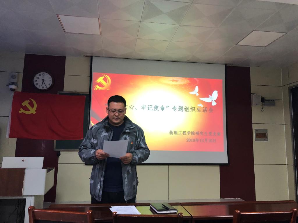 根据学校党委组织部的相关通知要求,12月10日下午,学院研究生党支部在物理楼313会议室召开“不忘初心、牢记使命”专题组织生活会,并开展民主评议党员工作,研究生党支部全体党员参加,院党委委员、副院长王海龙教授列席参加,会议由支部书记孙海瑞同志主持。