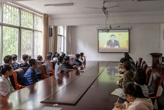 师生热烈关注,学院党委书记杨志英、团委书记王琼带领主要学生干部观看大会盛况。