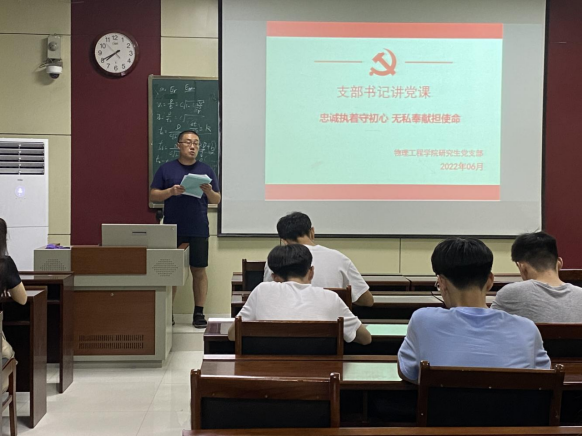 研究生党支部书记张守宝以“忠诚执着守初心 无私奉献担使命”为题讲党课。他以向全国优秀共产党员张桂梅同志事迹学习出发,结合实际,强调了教育工作的重要性,对研究生党员提出要求,学好专业知识,守初心敢担当,用自己的一身本领,服务国家建设。