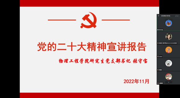 教工党支部书记郑萌萌以《深入学习与践行党章》为宣讲报告主题,提出要自觉地学习党章、遵守党章、贯彻党章、维护党章,为全面建设社会主义现代化国家、全面推进中华民族伟大复兴而团结奋斗。研究生党支部书记张守宝以《凝聚力量、团结奋进,让党的二十大精神融入青春主旋律》为宣讲报告主题,号召广大学生党员要争做表率,响应组织号召、服从组织安排,主动投身志愿者队伍,为学校疫情防控工作贡献力量。本科生党支部书记颜冲以《学习党的二十大精神,争做担当民族复兴大任的新时代青年》为宣讲主题,激励全体党员坚定理想信念、传承红色基因、练就过硬本领、强化责任担当,不负韶华、不负时代、不负人民,自觉把国家未来和民族希望扛在肩上,用青春力量践行使命任务,努力奋斗。