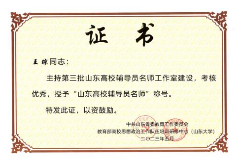 党委副书记、工作室主持人王琼被授予“山东高校辅导员名师”荣誉称号。