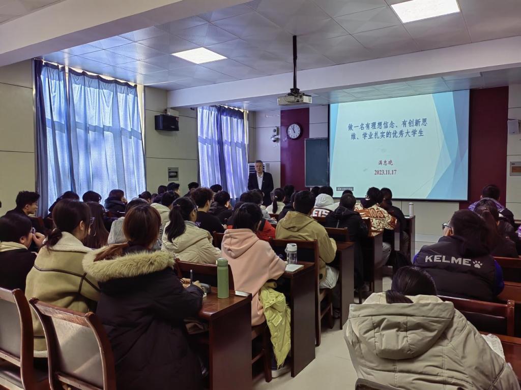 满忠晓以“做一名有理想信念、有创新思维、学业扎实的优秀大学生”为题,以谈话、交流的形式,向同学们强调拥有理想信念和创新思维对当代大学生的重要性,激励同学们要坚定理想信念,锻炼创新思维,将重心放在学业上,努力做到自律、自省、自强,成长为对党和国家事业发展有用之才。