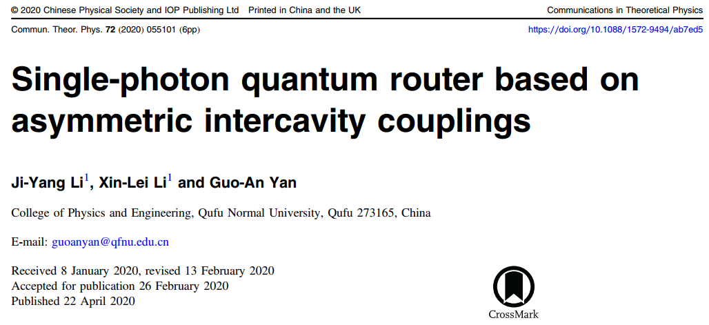 为第一完成单位,李霁洋和李新蕾为论文的共同第一作者,闫国安博士为论文的通讯作者。期刊Communications in Theoretical Physics是专门发表理论物理方面的研究工作,2020年最新影响因子1.416,中科院分区SCI三区。