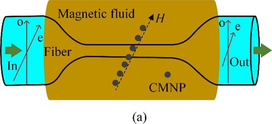 将微纳光纤浸入磁流体,并沿垂直于光纤方向施加调制磁场,设计出可调光纤偏振器(Appl. Phys. Lett., 2017, 111(9): 093503, SCI二区TOP)(报道网址://aip.scitation.org/doi/10.1063/1.4985114),实现对光偏振度、偏振方向的任意调制。由于微纳光纤的鲁棒性较差,操作难度大,我们研究基于D形光纤与磁流体的可调偏振器(Chin. Opt. Lett., 2020, 18(1): 010601, SCI三区)。将D形光纤浸入磁流体后,施加平行于D形光纤抛光表面的磁场,设计出一种鲁棒性好的可调光纤偏振器(报道网址://www.clp.ac.cn/EN/Article/OJece9ae3a9cb66dad)。这两项成果都证明,磁流体的磁光二向色性在光纤偏振调制中起关键作用。