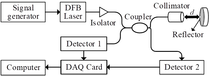 研制基于拐点检索进行相位解包裹的波长扫描激光测距仪(Opt. Commun., 2018, 410: 292-296, SCI三区)。利用正弦信号调制DFB激光器的光波长,干涉信号由光电探测器采集,经数据采集卡AD转换后,由计算机处理。根据干涉信号编程构造正交信号,利用正交解调算法,实现对距离(相位)的快速测量。已经获授权发明专利两项,可广泛用于检测物理、化学、生物量。(报道网址://www.sciencedirect.com/science/article/pii/S0030401817309379?via%3Dihub)