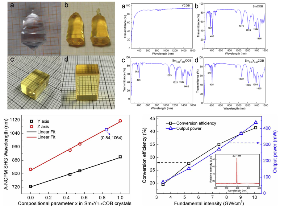 研究团队在SmxY1-xCOB系列晶体倍频性能研究过程中,通过理论计算晶体倍频性质时发现该系列晶体Y轴一类和二类非临界倍频波长范围分别为723-903 nm和1023-1390 nm,Z轴一类非临界倍频波长范围为827-1123 nm,可调谐范围非常宽泛。因此团队采用提拉法生长了SmxY1-xCOB系列晶体,并对其光学性质进行系统表征。采用794 nm的飞秒光源进行倍频实验,Sm0.44Y0.55COB晶体实现了397 nm蓝光高效输出。相关成果发表在Journal of Alloys and Compounds, 762(2018)431-437上,刘彦庆博士为第一作者,污污漫画