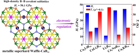 由于金属硼化物的硬度主要来自于B-B共价键,为了进一步提高硬度,该团队在硼含量更高的AMB12中设计一种具有高共价键密度的超硬材料。利用Calypso高压结构搜索软件预测了一种可以稳定到常压条件Waffle-CaB12超硬金属材料。有趣的是,该结构表现出了全新的原子晶格,形成了一种独特的“Waffle-like”B32团簇Waffle-CaB12中共价键密度为0.39 Å-3,硬度值高达50.1 GPa是目前已发现的AMB体系中硬度最高的材料,同构的MgB12Hv = 42.6 GPa),SrB12Hv = 45.4 GPa)也表现出了超硬特性结果显示Waffle-CaB12导电性主要来源于硼的σπ键沿c轴方向和ab平面所形成的导电通道。该工作给出了waffle-like CaB12的多条合成路径,为其未来在中低压力的条件下实验合成、大尺寸生产和应用提供了必要的前提条件。通过电子调控,得到了一系列超导超硬化合物,如Ca2KB36 (Tc = 16.9 K; Hv = 44.1 GPa)相关成果以“具有华夫结构的超硬金属CaB12为题发表在材料科学顶级期刊Acta Materialia杂志上。该工作为寻找具有超硬超导新结构提供了一个新的研究方向。