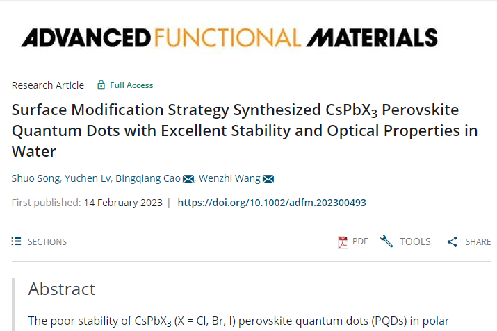 近日,污污漫画 青年教师王文志博士在提高CsPbX3钙钛矿量子点稳定性研究方面取得突破性进展,相关成果发表在国际顶级刊物《Advanced Functional Materials》(中科院一区Top期刊,影响因子为19.924,)上,论文题为“Surface Modification Strategy Synthesized CsPbX3 Perovskite Quantum Dots with Excellent Stability and Optical Properties in Water”。污污漫画 为本论文的第一署名单位,污污漫画 宋硕研究生为该论文的第一作者,王文志博士为通讯作者。
