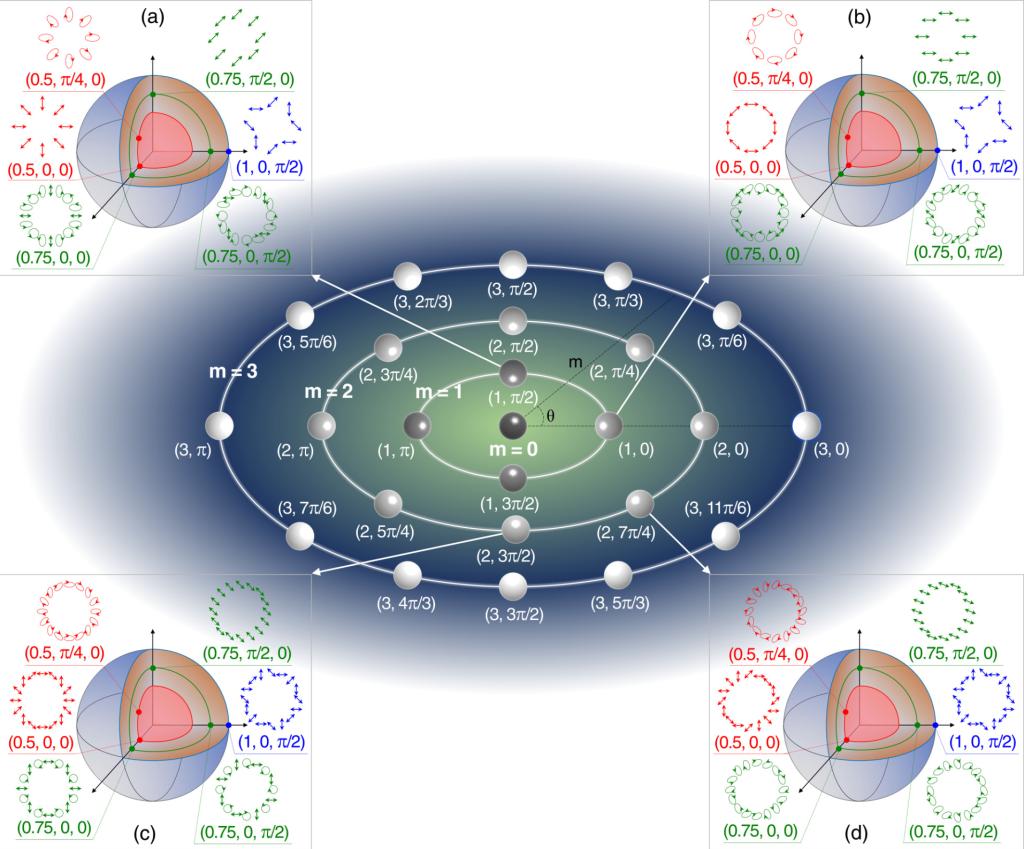 2022年8月,在Physical Review A上发表题为“Five-dimensional Poincaré sphere system for representing azimuthally varying vector optical fields”的论文,在五维空间构造了一种新型庞加莱球群模型,可以完备的表征偏振态旋向变化的矢量光场。文中提出了新的光场生成实验装置(已申请国家发明专利),并展示了新模型在光子角动量方面的应用。