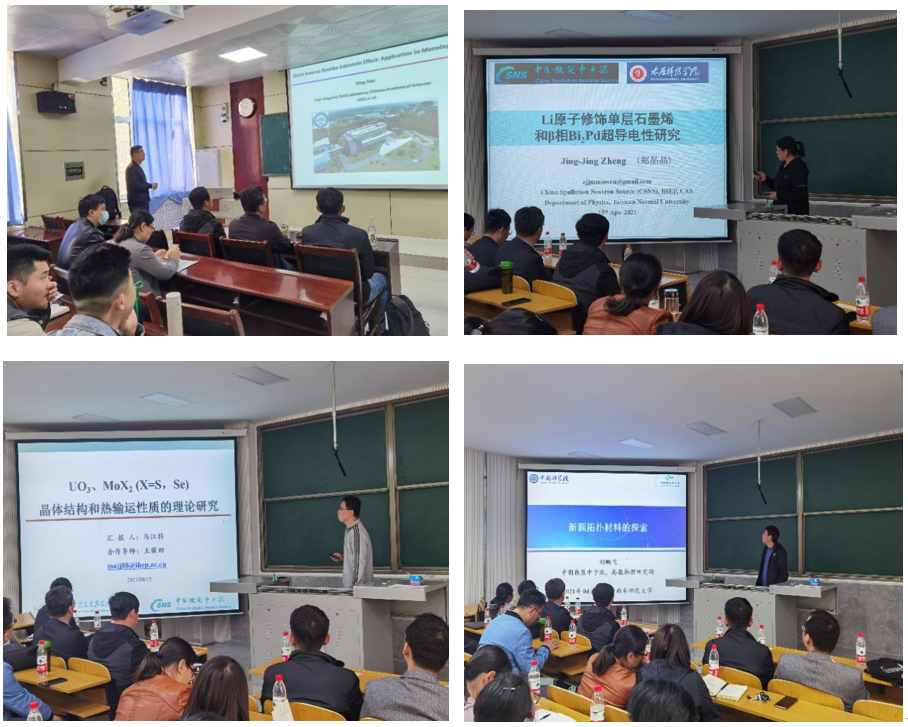 王保田研究员团队成员郑晶晶讲师、马江将博士后、刘鹏飞助理研究员分别报告了他们在超导、热输运、拓扑性质方向的研究成果。