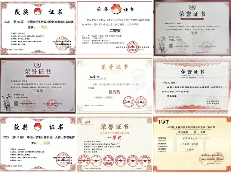 各赛事启动前,学院精心组织专项指导团队,制定个性化备战方案,全程为参赛学生提供辅导。获奖名单中,2022级物理学专业武子茂、2023级物理学专业周洛仰、2022级物理学专业王竟祺在“蓝桥杯”全国软件和信息技术专业人才大赛分别斩获国家级二等奖、三等奖、优秀奖;2023级光电信息科学与工程专业雷添锦于中国大学生计算机设计大赛获国家级二等奖;2022级物理学专业吴茂炎、刘峻志荣获全国大学生语言文字能力大赛国家级三等奖;2022级物理学专业孙家凡获第十五届全国周培源大学生力学竞赛国家级优秀奖;2022级光电信息科学与工程专业宁德钰、2023级物理学专业赵天瑞等多名同学均在省级比赛中表现优异,成绩斐然。